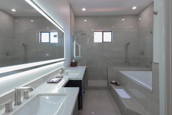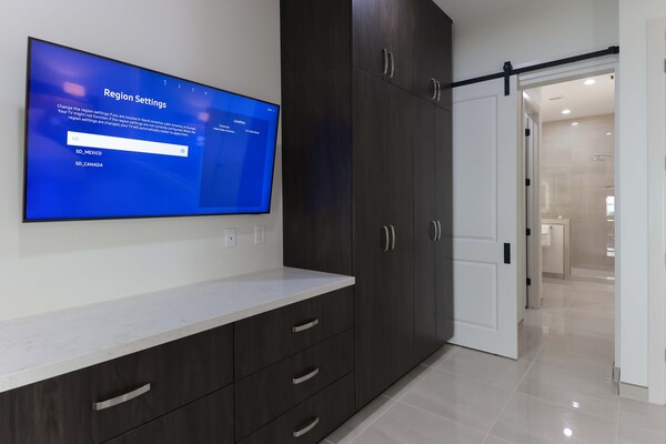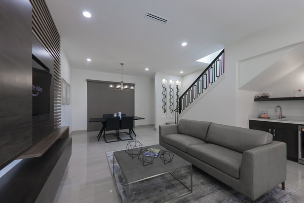 King Bed, two story luxury apartment style suite with living room, dining room, terrace, bar, jacuzzi, three head shower and spa amenities.